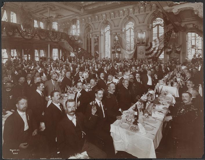 Large banquet hall at the Cafe Martin filled with men at tables at the French dinner.