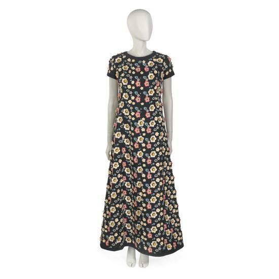 Ball gown in black silk and wool with applied velvet flowers