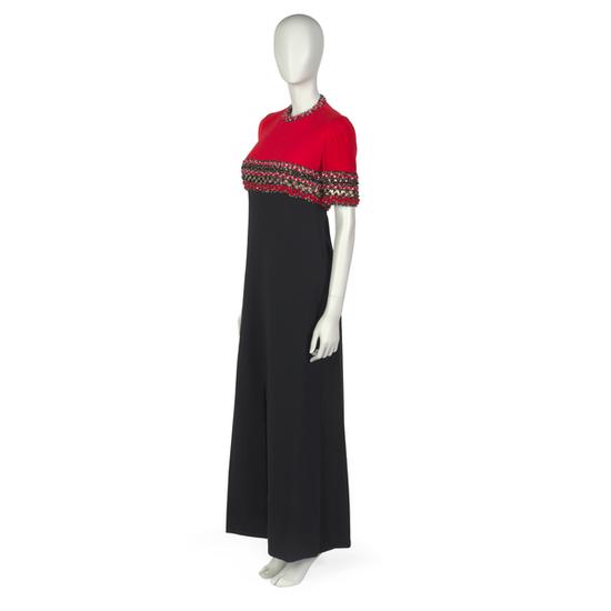 Evening ensemble comprising ball gown in off-white silk faille and stole in vermillion silk crepe