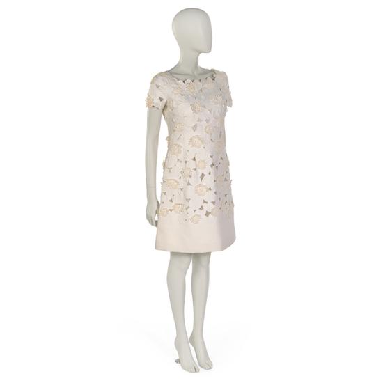 Dinner dress in white twill worsted with applied green, black and white plastic flowers at hem