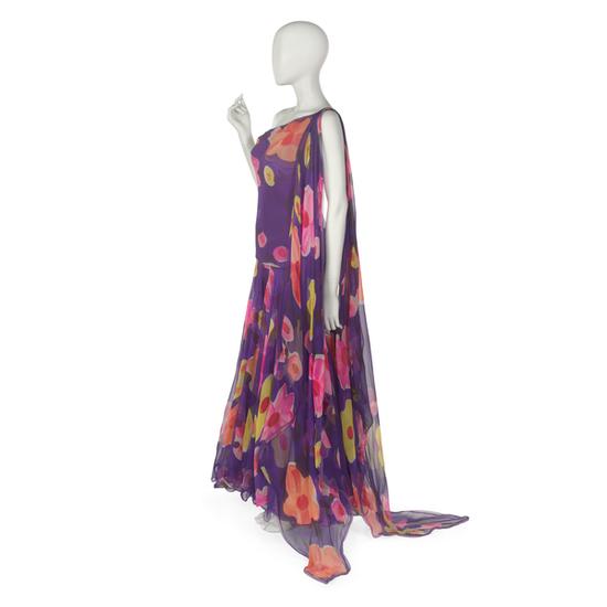 Evening ensemble in geometric printed cotton velveteen, comprising cloak and dress