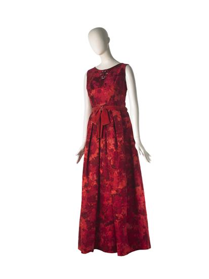 Evening ensemble: Lace dress and jacket, and floral bustle