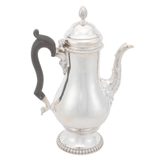 Coffee pot with wooden handle and inverted pyriform body on outwardly flared foot edged with gadrooning. S-scroll spout cast in halves, with leafage at base and leaf furl at lip. Wooden S-scroll handle in silver sockets, upper socket terminating in cast shell. Stepped domed cover with gadrooning at lip and raised hinge attached to upper handle socket and twisted flame finial soldered in place. Inscription: Engraved on foot: JOHN & SARAH JAY 1775 M. BANYER, 1829. Mark: Marked on base: N. York / C. DUNN.