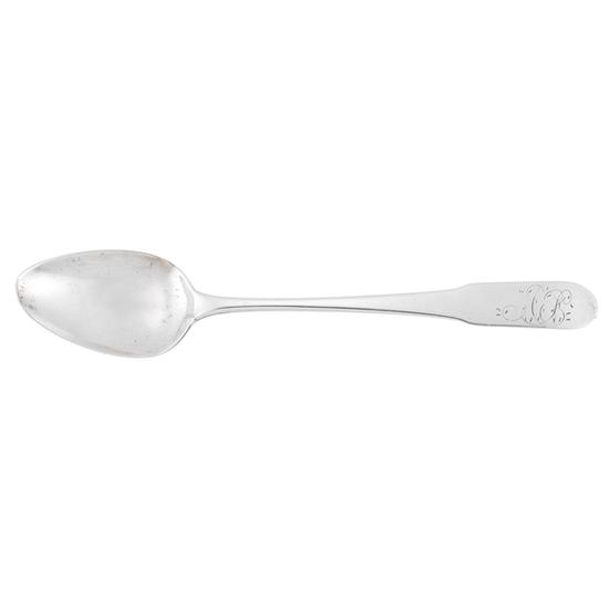 Teaspoon with rounded, downturned fiddle handle, back midrib and single bowl-back drop. Inscription: Unidentified initials on handle obverse: "AES" in script. Mark: On handle reverse: "T.D.D." and [sheaf of wheat] in rectangles.