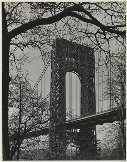 The Hudson River looking north from below the George Washington Bridge. Showing railroad tracks and the George Washington Bridge.