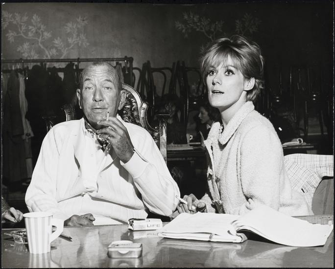 [Noel Coward and Elaine Stritch backstage during "Sail Away".]