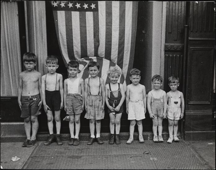Victory Parade, girls marching wearing flag dresses, 105th Street