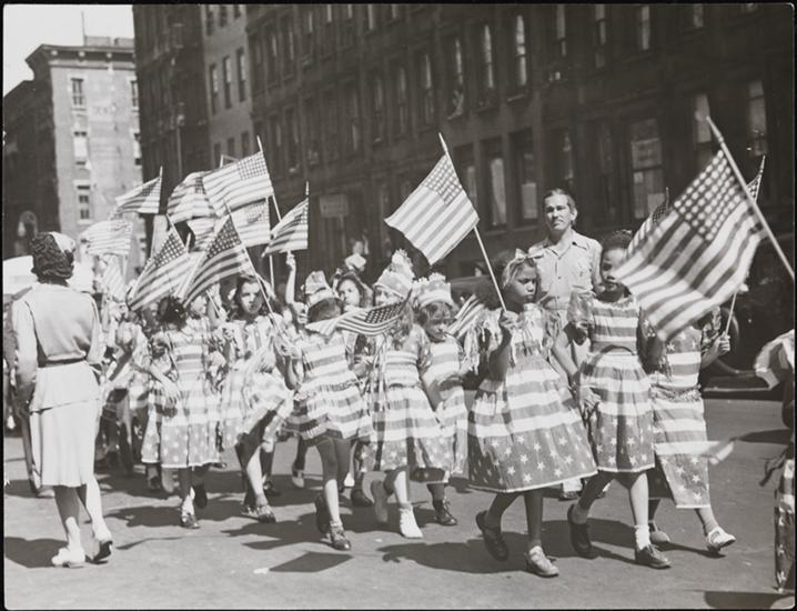 [Children marching in parade with American Flags.]
