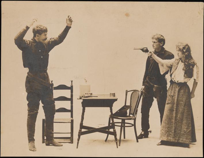 ["The Gods of the Mountain" theater still.]