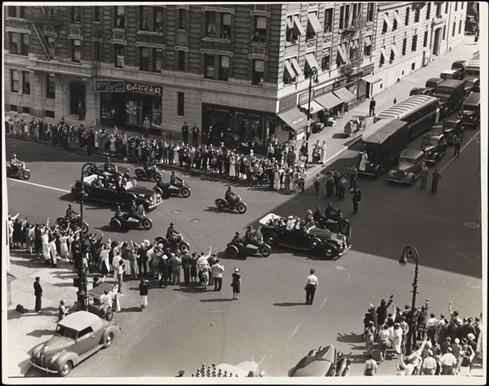 Victory Parade, view of fairy princess in front of figures dressed as Hitler, Hirohito, and Mussolini, 105th Street