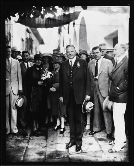 [Al Smith with Hebert Hoover and another man at an automobile show.]