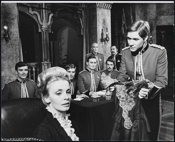 [Michael Barrington as Colonel Strang, Paul Jones as 2nd Lt. Arthur Drake, and Donald Pickering as Capt. Rupert Harper in "Conduct Unbecoming".]
