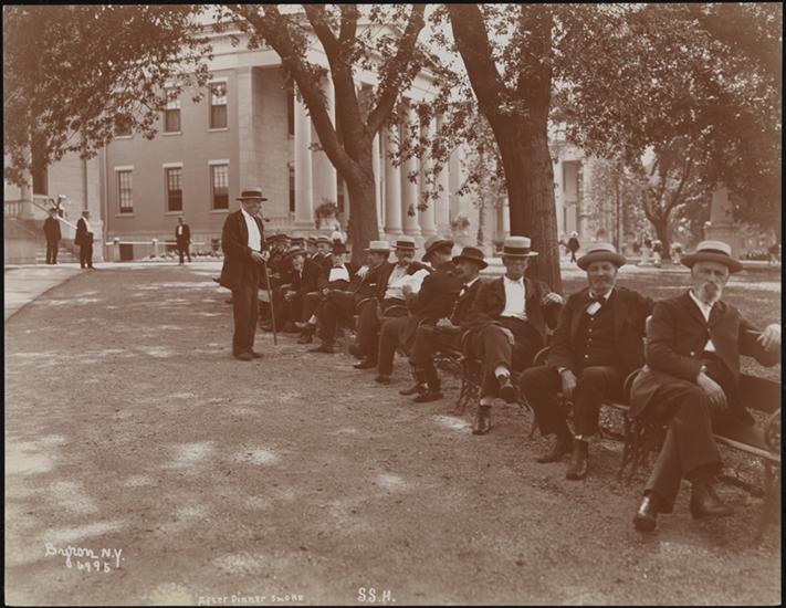 Men seated on benches, smoking after dinner, at Sailor's Snug Harbor, a facility and home for retired sailors on Staten Island, New York.