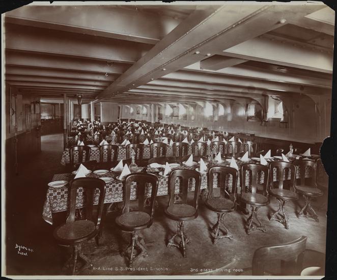 "H-A Line, S.S. President Lincoln, 3rd Class Dining Room" on neg.