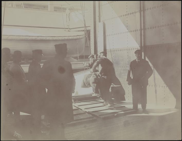 People loading or unloading luggage on a gang plank to the S.S. "Kaiserin Auguste Victoria".