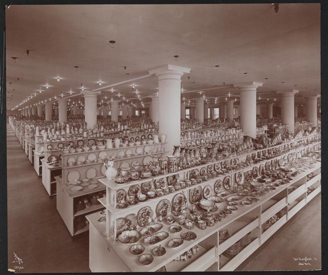 Interior of George Borgfeldt & Co. store, with tables cluttered with bric-a-brac, including pottery, vases, china, etc.