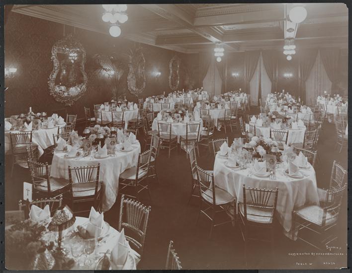 Banquet room filled with tables set for the dinner given to Mark Twain in honor of his 70th birthday at Delmonico's.