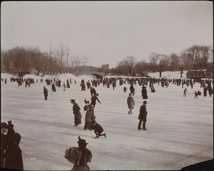 People on a frozen lake in Central Park, the bow bridge is visible.