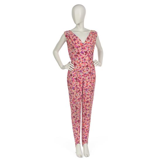 Jumpsuit of silk jersey printed in black, purple, plum, olive green, orange, chartruese, white and shades of pink
