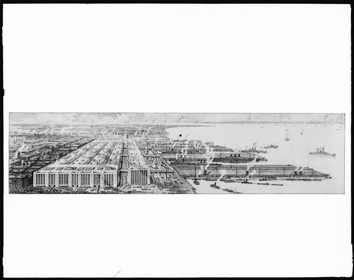 Second set of Drawings of Army base, bird's-eye view showing warehouses, rendering by Hugh Ferriss, 1918.