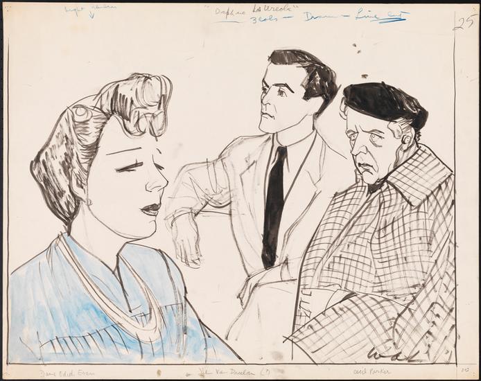 [Laurence Hanray as Sir Orpheus Midlander, Jessica Tandy as Deaconess, and John R. Turnbull as General Flanco De Fortinbras in "Geneva".]