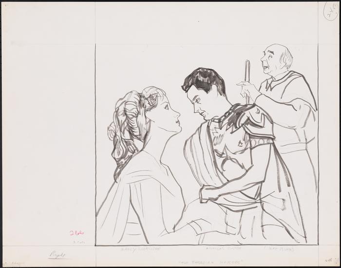 [Meg Mundy as Rosaline, Joseph Schildkraut as Don Adriano de Armado, Philip Bourneuf as Holofernes, and Nancy Marchand as Princess of France in "Love's Labour's Lost".]