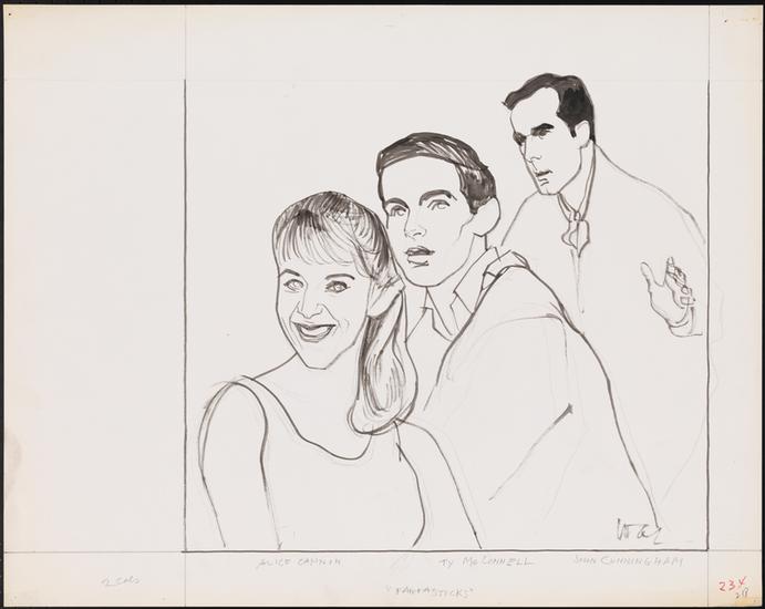 [Liza Stuart as Luisa, Gene Rupert as El Gallo, and Kenneth Nelson as Matt in "The Fantasticks".]