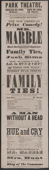 Mr. Marble in "Family Ties", Wednesday evening, June 17. To conclude with "The Backwoodsman; or, The Game Cock of the Wilderness"