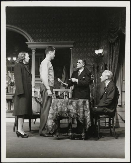 [Melville Cooper as Arthur Birling, Thomas Mitchell as Inspector Goole and Doris Lloyd as Sybil Birling in "An Inspector Calls".]