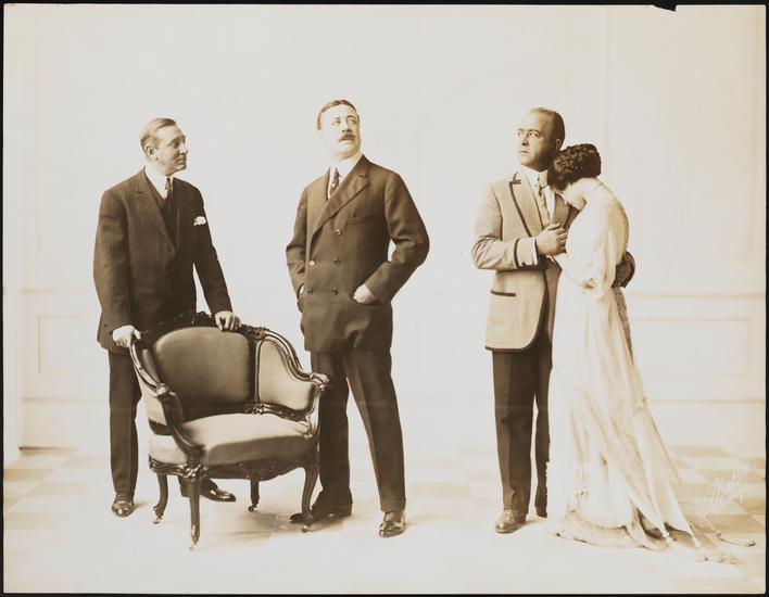 [Wilton Lackaye as John Brand, Max Figman as Dick Meade and Lolita Robertson as Mrs. Reynolds in Act 4 of "Fine Feathers".]
