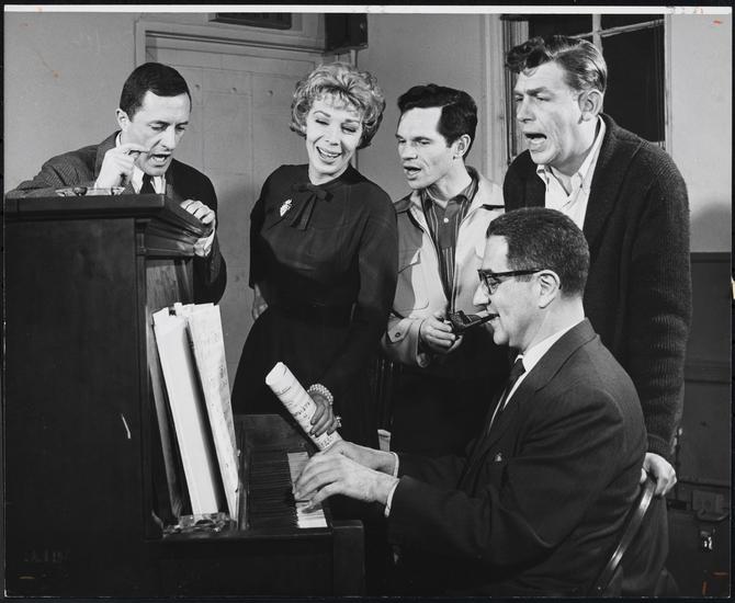 [Michael Kidd (director/choreographer), Leonard Gershe (author) and Harold Rome (lyricist and composer) at a rehearsal for "Destry Rides Again".]
