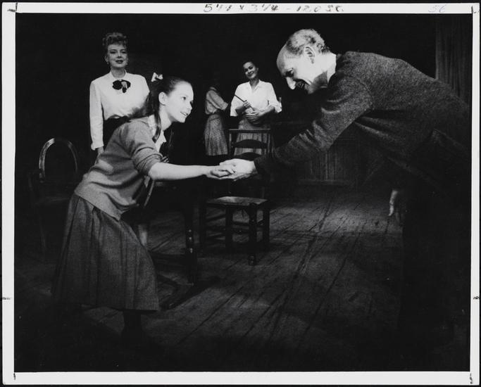 [Joseph Schildkraut as Otto Frank, Jack Gilford as Mr. Dussel and Dina Doronne as Anne Frank in "The Diary of Anne Frank".]