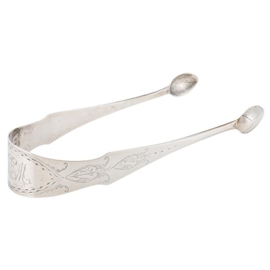 Bow-type tongs, with bright-cut decoration and egg-shaped grips. Inscription: Engraved on bow: GEM.