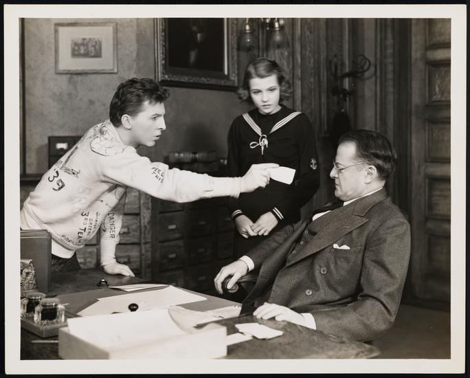 [Ezra Stone as Henry Aldrich, Vaughan Glaser as Mr. Bradley and James Corner as George Bigelow in "What a Life".]
