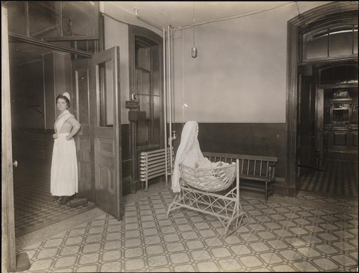 Mount Sinai Hospital, Children's Ward. Sharp view of ward in wheels and nurse.