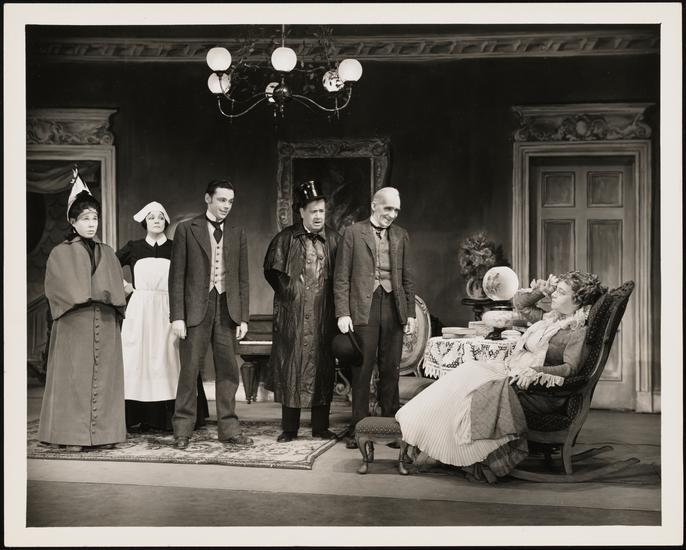 [John Call as Barnaby Tucker, June Walker as Mrs. Molloy, Tom Ewell as Cornelius Hackl and Nydia Westman as Minnie Fay in "The Merchant of Yonkers".]