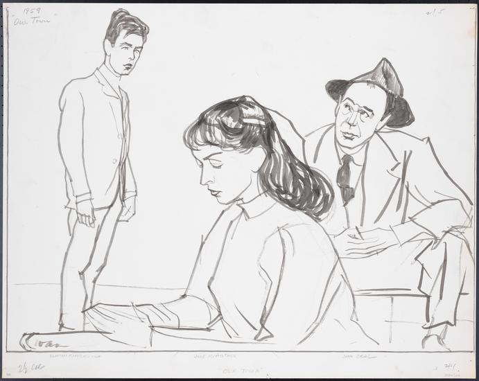 [Frank Craven as the Stage Manager, Evelyn Varden as Mrs. Gibbs, and Martha Scott as Emily Webb in "Our Town".]