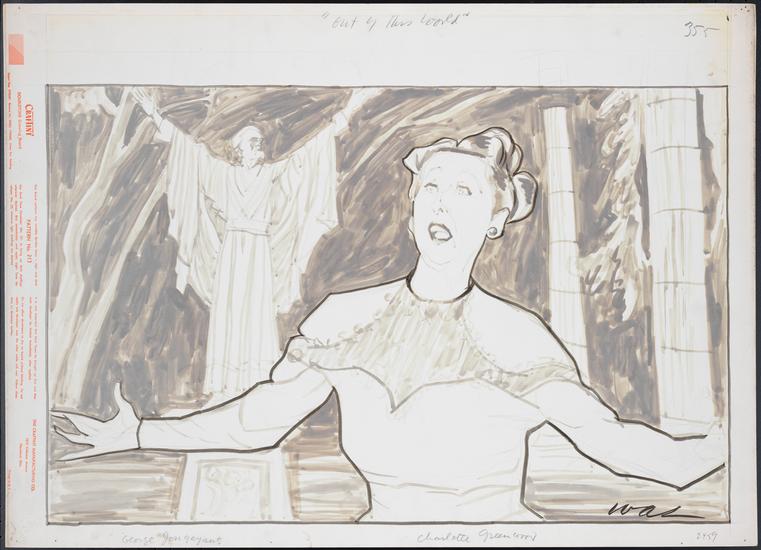 [Priscilla Gillette as Helen, William Eythe as Art O'Malley and Charlotte Greenwood as Juno in "Out of This World".]