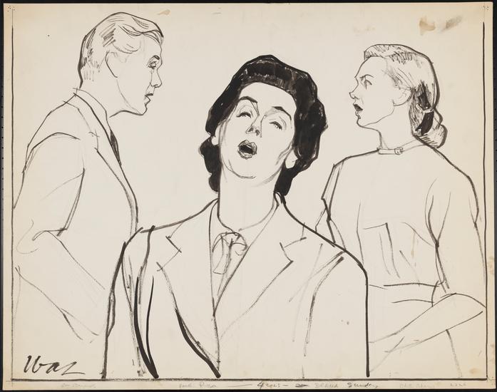 [Edith Adams as Eileen Sherwood, George Gaynes as Robert Baker and Carol Channing as Ruth Sherwood in "Wonderful Town".]