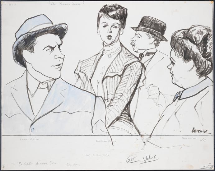 [Robert Preston as Harold Hill, Barbara Cook as Marian Paroo and David Burns as Mayor Shinn in "The Music Man".]