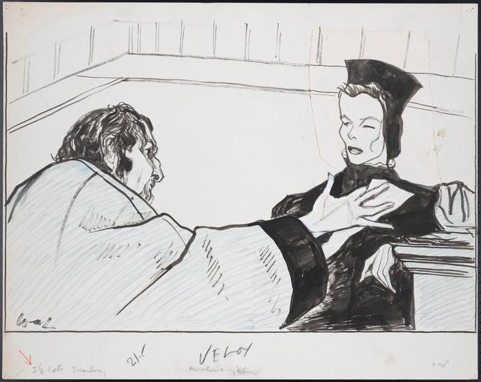 [Carol Gustafson as Portia and Boris Tumarin as Shylock in "The Merchant of Venice".]