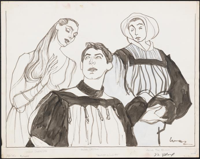 [Inga Swenson as Solveig, Joanna Roos as Aase and Fritz Weaver in the title role of "Peer Gynt".]