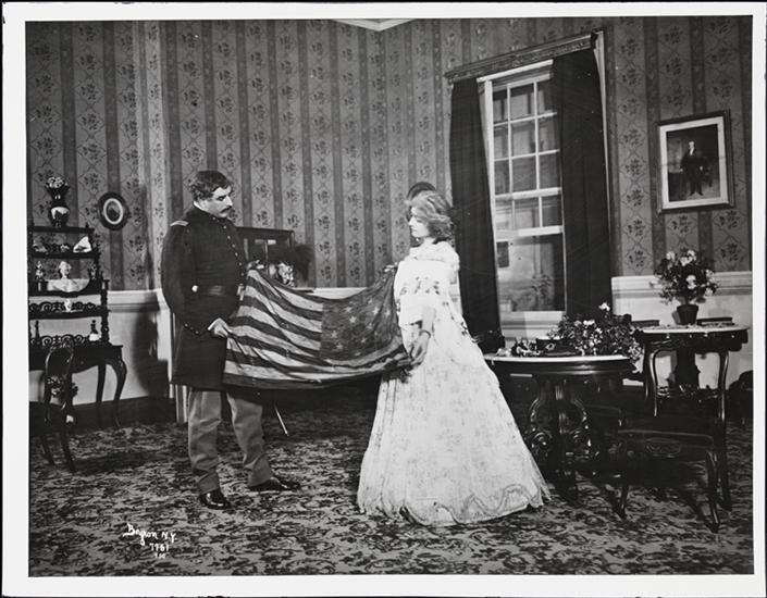 A scene from the romantic drama by Cylde Fitch, "Barbara Frietchie," produced by Charles Frohman at the Criterion Theatre, New York, in 1899, featuring Julia Marlowe as Barbara Frietchie.
