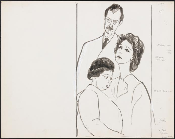[Donald Cook as Oliver Casey, Glenda Farrell as Isabel Chamberlain and Cloris Leachman as Amy Grenville in "Masquerade".]
