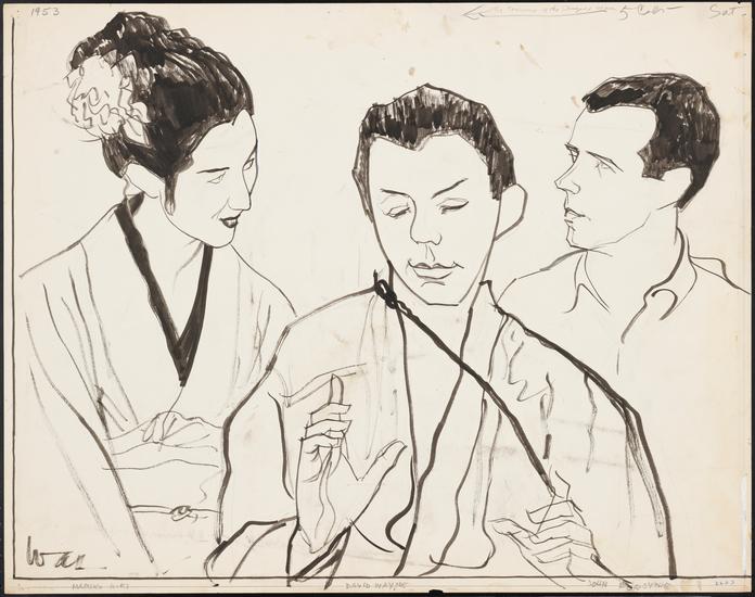 [David Wayne as Sakini, Mariko Niki as Lotus Blossom and John Forsythe as Capt. Fisby in "The Teahouse of the August Moon".]