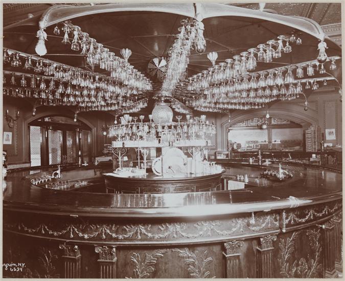 French Line, S.S. "Paris", First Class, Interior, Bar with Chief Barkeeper Georges Che'neau & Gabriel Maillar (Cashier) as Passenger.