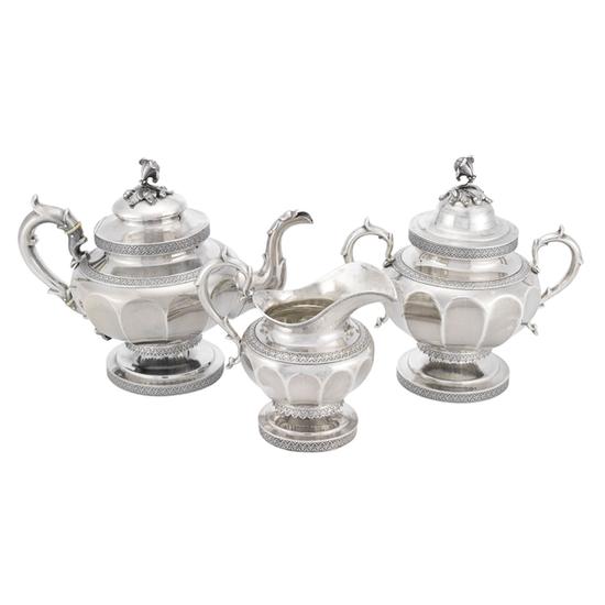 Teapot part of a three-piece tea service with 12-sided paneled body on stepped circular foot, foot, shoulder and juncture of foot and body with inserted die-rolled heart borders, with outer margin of border cut away at juncture of foot and body, S-scroll handle, ivory insulators inserted in pot handle, and pot with cast floral finials on domed cover. Mark: Struck on underside of body: N. J. BOGERT.