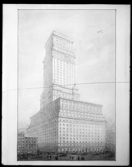 Madison Square Garden design, view with tall tower, rendering by Hugh Ferriss.