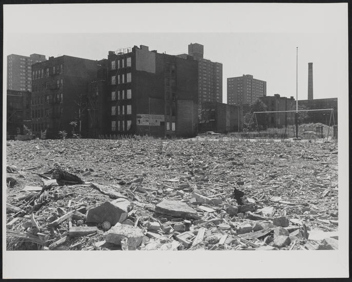 [Unidentified brick building next to rubble-strewn vacant lot.]