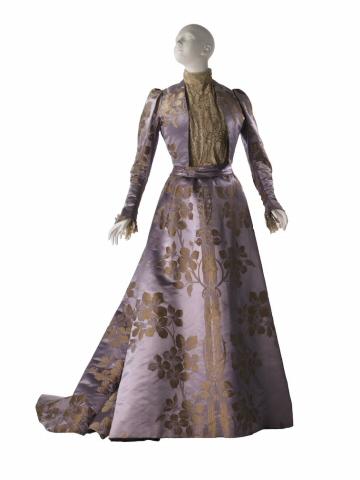 Tea gown in lavender satin damask
